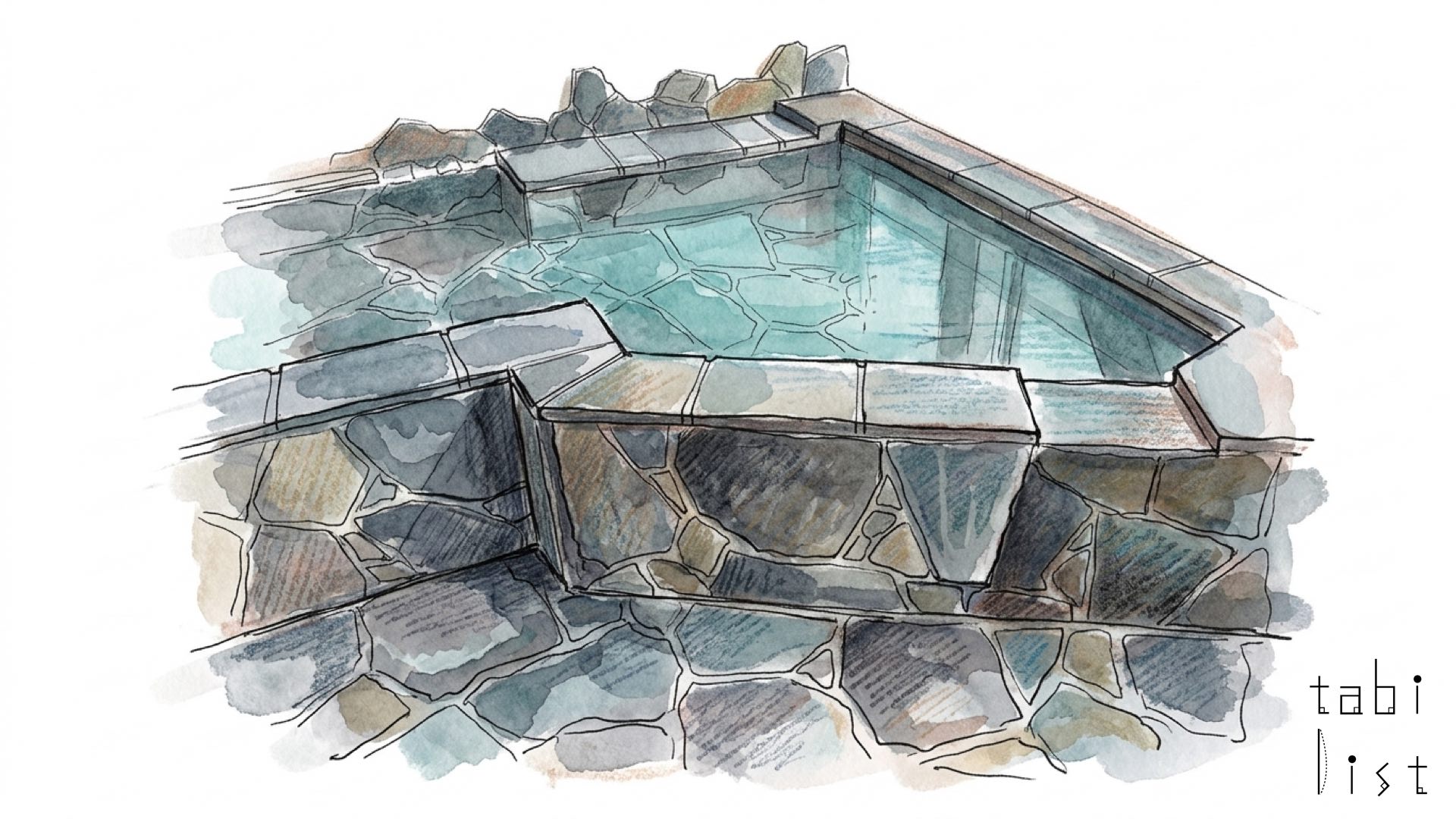 お宿の大きな魅力は、六室あるすべての客室に源泉かけ流しの半露天風呂が備わっていることです。他のお客様を気にすることなく、お好きな時間に何度でも、とろりとしたお湯を満喫できます。お部屋によってお風呂の形が異なり、それぞれ趣の違う湯浴みをお楽しみいただけるのも素敵なところです。また、広々とした大浴場もございます。こちらも源泉をそのまま使用しており、ジャグジーやうたせ湯、寝湯などの設備も充実しています。旅の疲れを心ゆくまで癒やすことができますが、現在ミストサウナは休止中ですのでご注意ください。