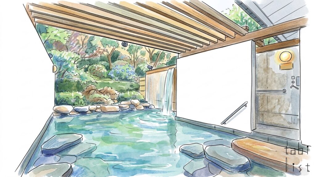 この尚玄山荘は、オーナーのおじい様にあたる徳永尚玄氏のお名前を受け継いでいます。館内は数々の賞に輝いた現代建築の美しい佇まいが特徴で、まるで美術館のような雰囲気をお楽しみいただけます。全ての客室から望める千三百坪の日本庭園は、四季折々に異なる表情を見せてくれる自慢の景色です。特に夜には幻想的にライトアップされ、訪れる人々に非日常の癒やしをお届けしています。尚玄山荘のお風呂は、源泉かけ流しの天然温泉をたっぷりとお楽しみいただけます。天然石を配した広々とした大浴場と、庭園を眺めながらゆったりと浸かれる露天風呂があり、露天風呂には珍しい打たせ湯もございます。泉質は弱アルカリ性単純温泉で、神経痛や筋肉痛、冷え性などにも効果があると言われます。また、2023年6月には、高台に別邸さくらが新しくオープンいたしました。こちらのお部屋では、プライベートな半露天風呂から穏やかな四季の風景を独り占めする贅沢な時間をお過ごしいただけます。