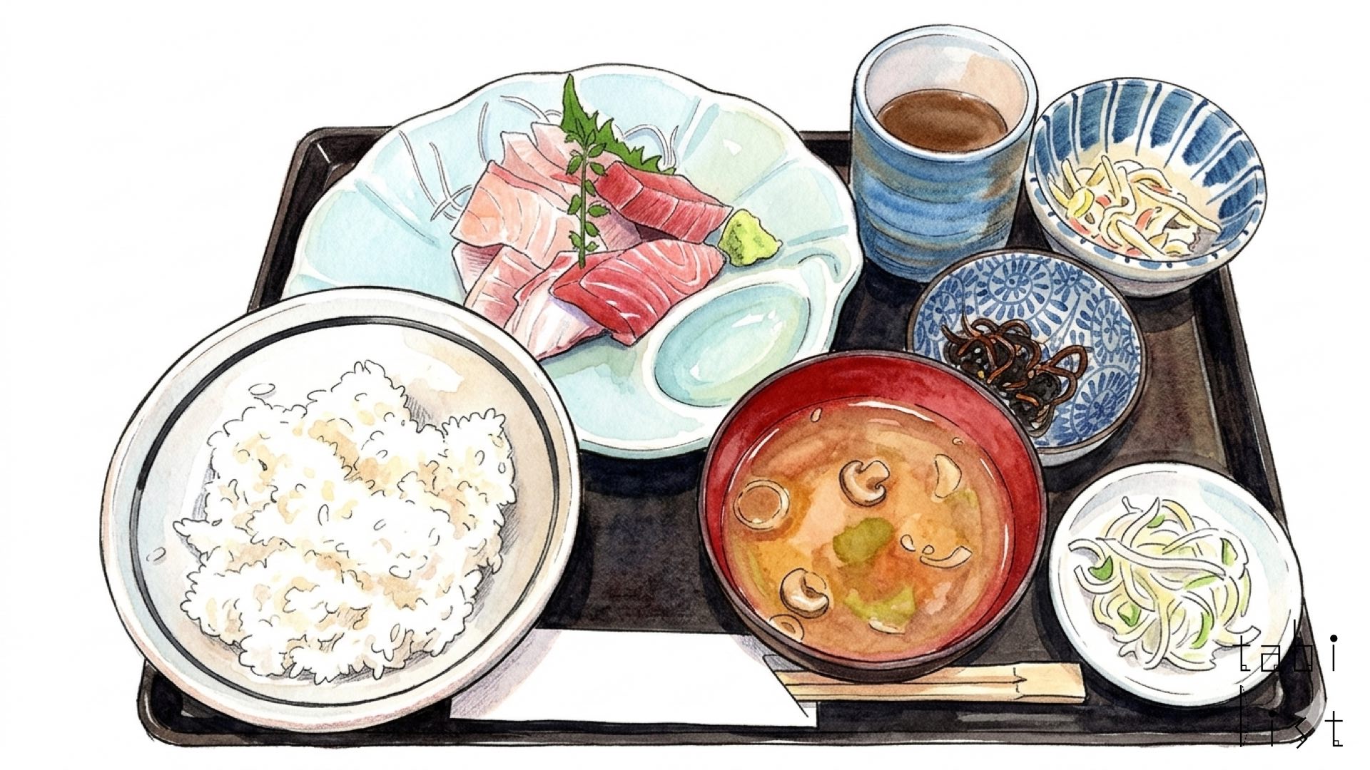 お店の名物として多くのお客様に親しまれているのは、何といっても「天然ぶり丼」です。脂がのった旬の天然ぶりを大きく厚めに切り、お店特製のわさび醤油で軽く漬けにして、旨みがぎゅっと凝縮されています。ご飯の上には、香ばしいゴマや海苔、さわやかな青ネギがたっぷりと敷き詰められていて、様々な香りや食感とともに、ぶりの豊かな味わいを楽しめます。大変人気がありますので、お昼の早い時間に売り切れてしまうこともあるそうです。