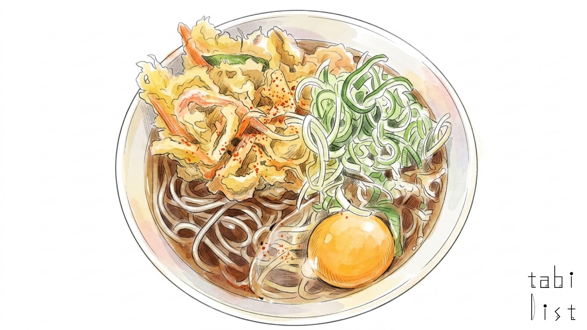 多くの人が選ぶのは、しっかりとした満足感が得られる天玉そばです。醤油の風味がほどよく効いたコクのあるつゆが、やわらかく茹で上げられた麺によくなじみます。そこに大ぶりのかき揚げと生卵が加わることで、味わいに奥行きが生まれ、ひと口ごとにやさしい変化を楽しめます。かき揚げを少しずつつゆに浸しながらいただくと、軽やかな食感からしっとりとした口当たりへと移ろい、最後まで飽きのこない一杯に仕上がっています。
