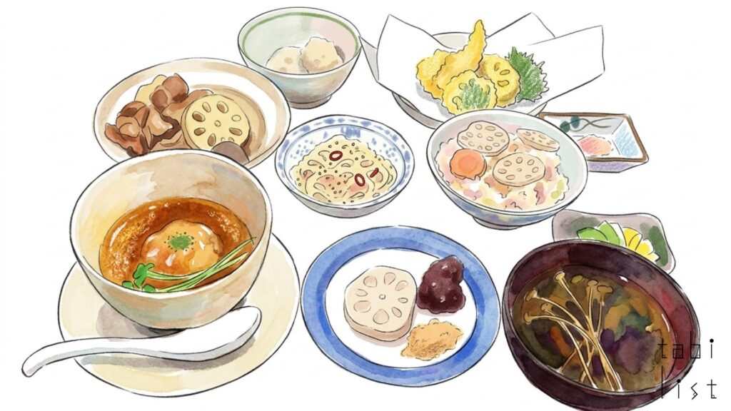 お店でまず味わっていただきたいのは、シンプルな調理法だからこそ素材の力が際立つ門真れんこんの天ぷらです。サクッとした薄衣を噛みしめると、中から現れるのは驚くほどホクホク、そして糸を引くようなもっちりとした身で、噛むほどに大地の甘みが口いっぱいに広がります。また、門真の伝統的な家庭の味を現代に伝えるれんこんの白あえも、シャキシャキとした食感と滑らかな豆腐のコクが絶妙に調和した、心落ち着く逸品です。これらの一皿ひと皿が、単なる「野菜」としての枠を超えた、力強い生命力を感じさせてくれます。