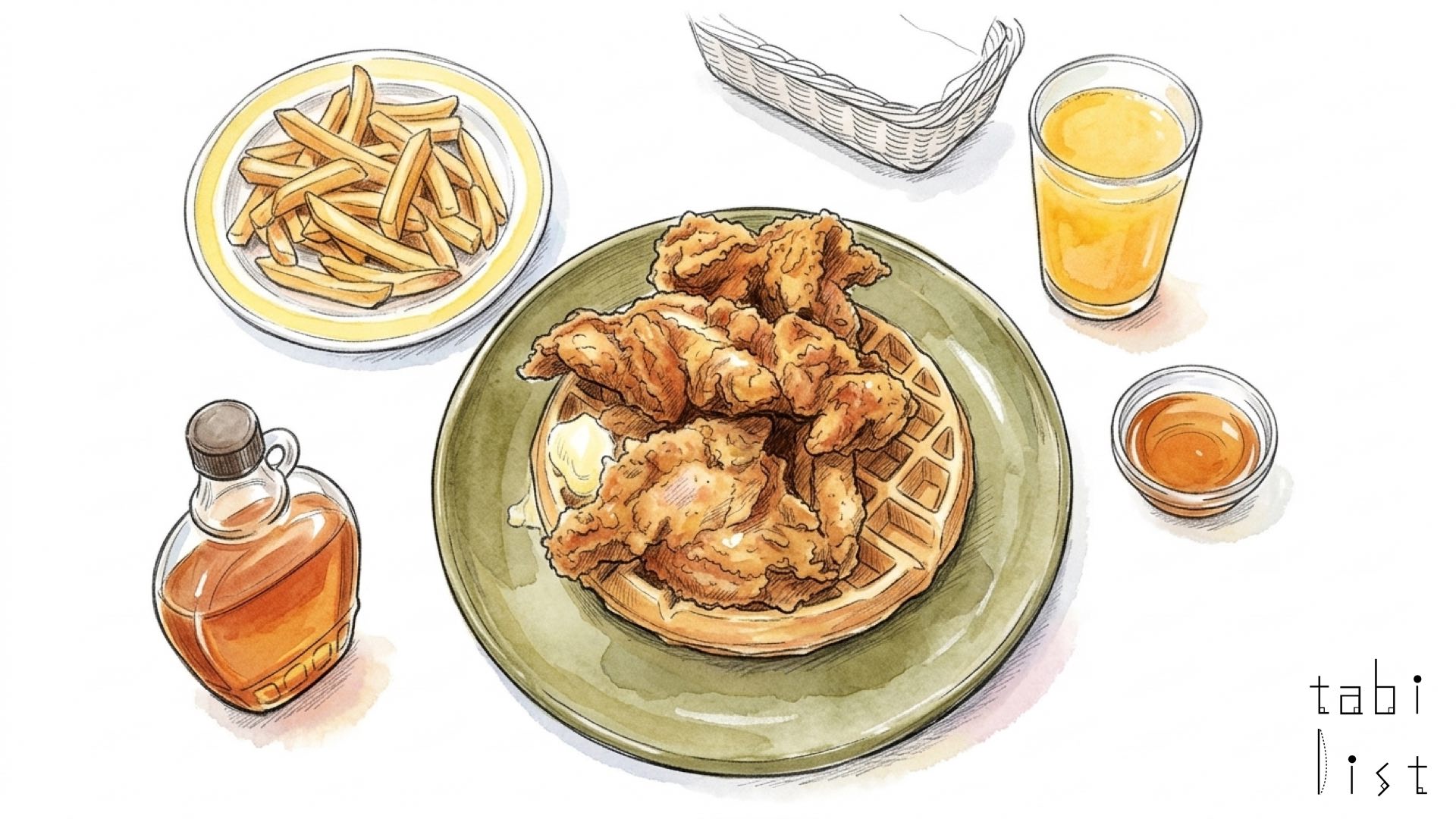 訪れたら目を引くのがチキンワッフルです。ワッフルの上に香ばしく揚げられたチキンがのり、甘さと塩気が重なり合う独特のバランスが楽しめます。ボリュームもあり、満足感のある一皿として人気を集めています。しっかり食べたいときには高さのあるハンバーガーも外せません。厚みのあるパティとふんわりとしたバンズが合わさり、食べ応えのある仕上がりです。