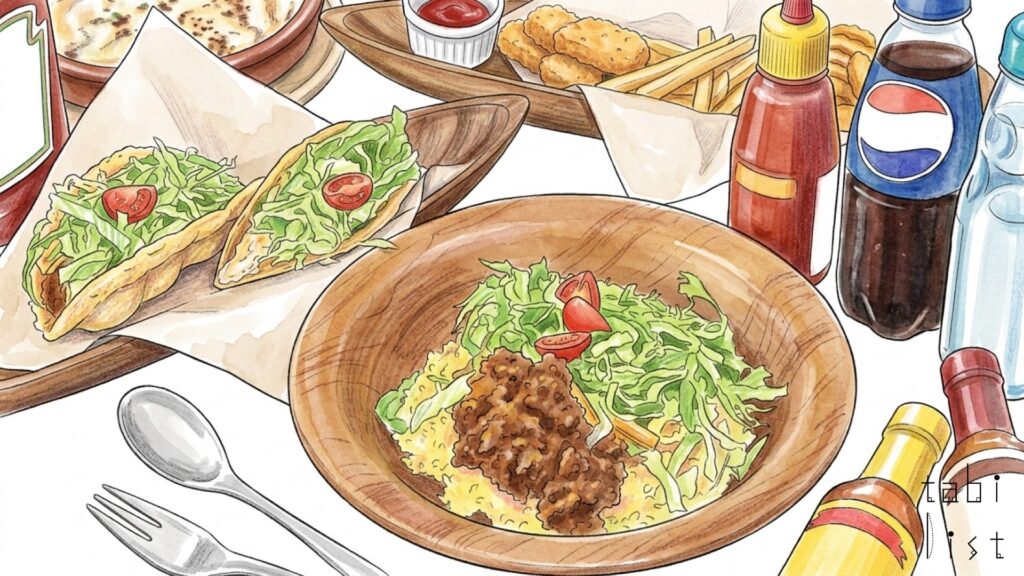 看板メニューのオリジナルタコライスは、スパイスの香りがほどよく広がるタコミートが印象的です。レタスやトマトのフレッシュな食感にチーズのコクが重なり、全体がバランスよくまとまっています。ひと口ごとに味の変化が楽しめるため、最後まで飽きずに味わえます。
