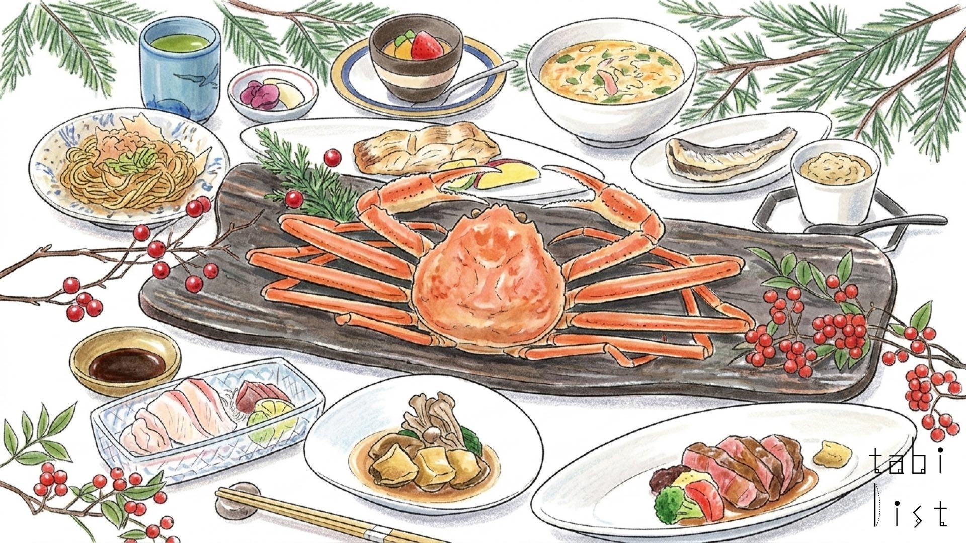 宿で提供される自慢の料理の中でも、カニ味噌を丁寧にアク抜きし、クリーミーな味わいに仕上げた「蟹みそのしゃぶしゃぶ」は、ぜひお試しいただきたい逸品です。また、塩水で茹でることで越前がに本来の甘みが引き立つ「茹で蟹」も高い評価を得ています。ランチタイムには、「刺身御膳」や、若狭牛をやわらかく仕上げた特製ハンバーグが人気の「ハンバーグ御膳」、他にも「肉じゃが御膳」や「ステーキ御膳」といった多彩なメニューが楽しめます。夕食のコースでは、冬季に提供されるセイコガニの身出し、香ばしい「焼き蟹」、そして新鮮な「蟹刺し」など、越前がにをさまざまな調理法で味わえる全10品の料理が堪能できます。