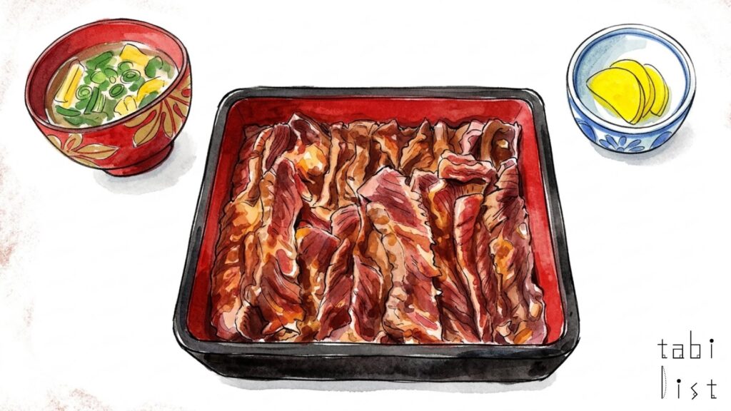 なかでも注目を集めているのがザブトンステーキ重です。やわらかな食感の希少部位をほどよく火入れし、ご飯の上にたっぷりと盛り付けた一品で、ひと口ごとに肉の旨みが広がります。甘みとコクのある特製だれが全体をまとめ、ご飯との相性も心地よく感じられます。その味わいは評判を呼び、撮影現場への差し入れとして選ばれたこともあるそうです。
